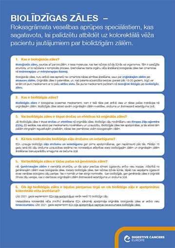 Rokasgrāmata veselības aprūpes speciālistiem, kas sagatavota, lai palīdzētu atbildēt uz kolorektālā vēža pacientu jautājumiem par biolīdzīgām zālēm.