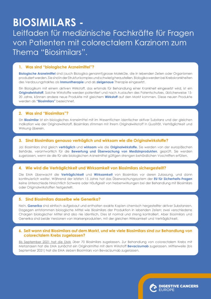Leitfaden für medizinische Fachkräfte für Fragen von Patienten mit colorectalem Karzinom zum Thema “Biosimilars”.