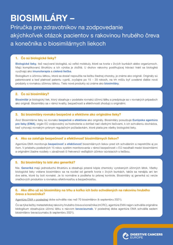 Príručka pre zdravotníkov na zodpovedanie akýchkoľvek otázok pacientov s rakovinou hrubého čreva a konečníka o biosimilárnych liekoch